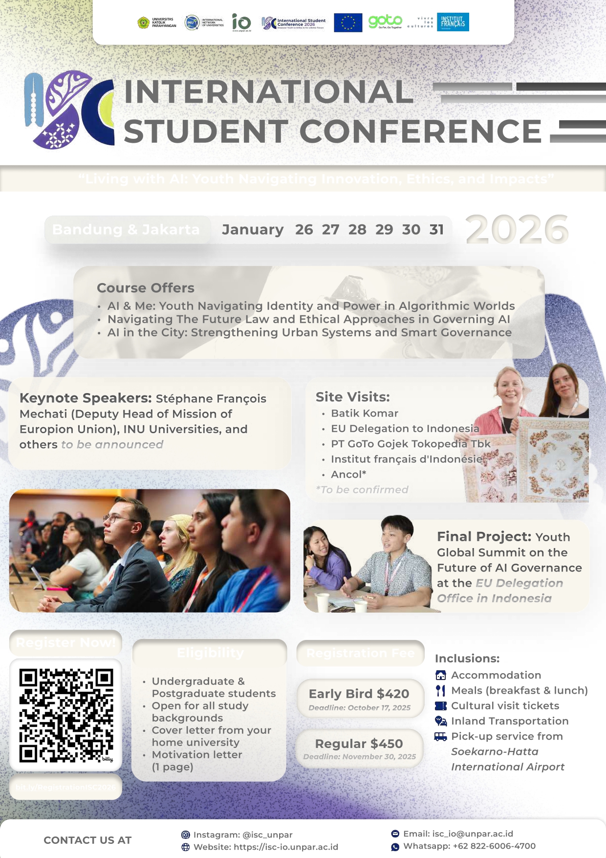 The International Students Conference (ISC) is a dynamic and collaborative event that transcends discussions about the future of living with the existence of AI. Navigating the ethical use of AI that is embedded in everyday life to ensure localized solutions for a just, inclusive, and sustainable society. ISC 2026 supports the 16th Sustainable Development Goals (SDGs) concerning inclusive societies to sustainable development and providing access to justice by emphasizing the role of youth, students, and local communities in shaping ethical and responsible uses of AI that address both global challenges and local realities.